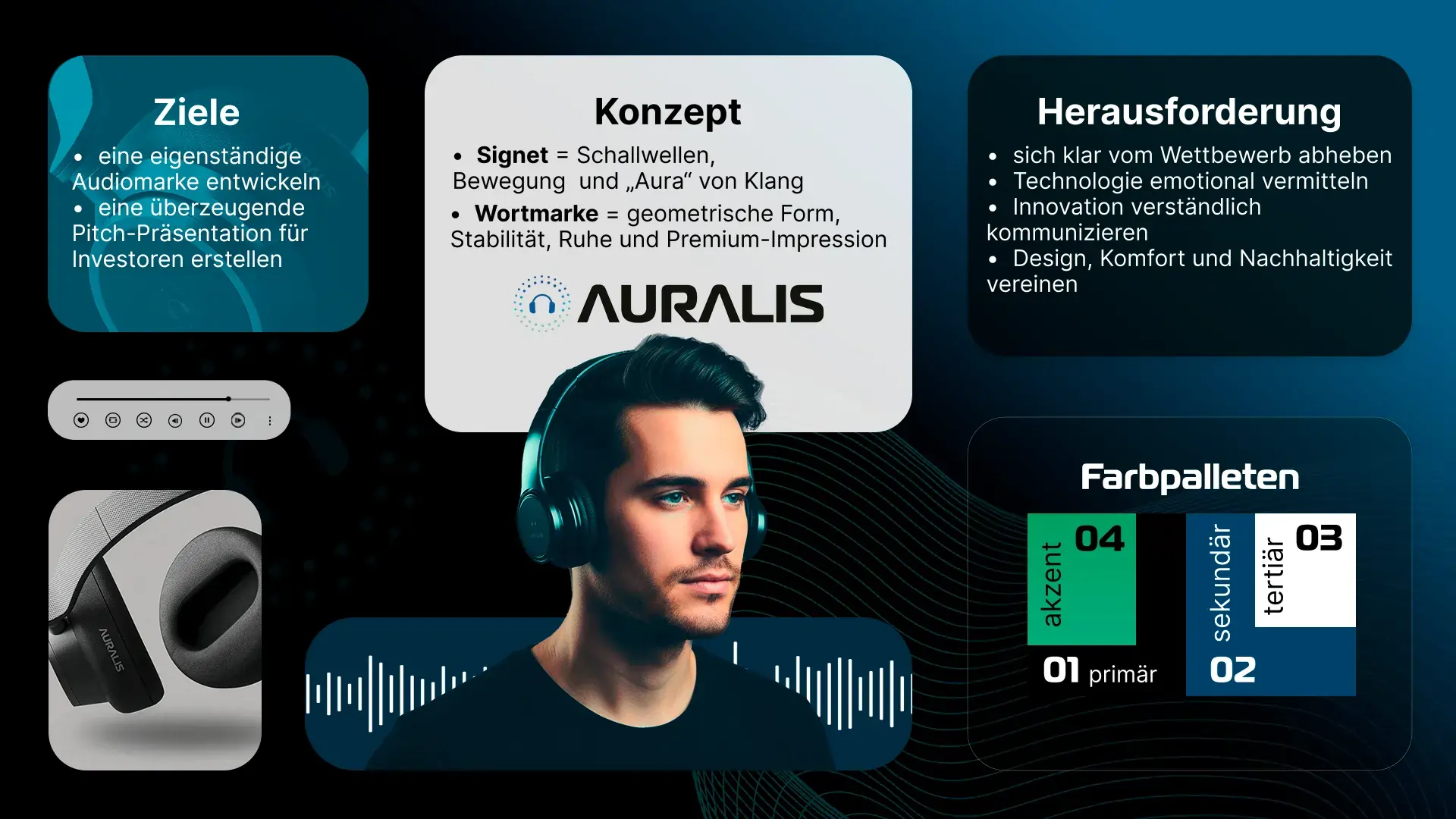 Auralis ist ein fiktives Branding-Projekt, in dem ich mich intensiv mit der Frage beschäftigt habe, wie Technik emotional erlebbar wird. Der Ausgangspunkt war ein Kopfhörer – das Ziel eine Marke, die nicht nur gut klingt, sondern sich gut anfühlt.
